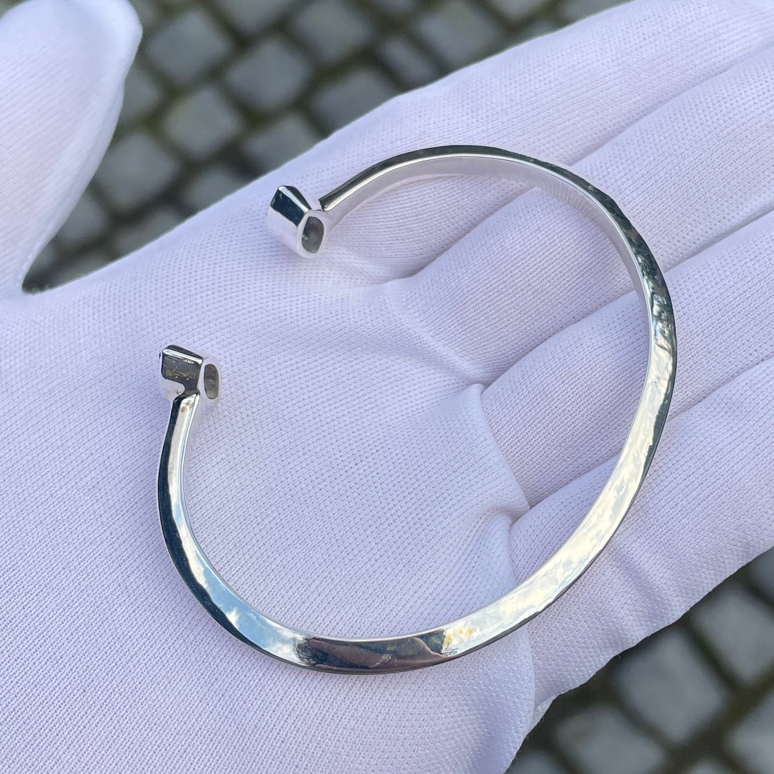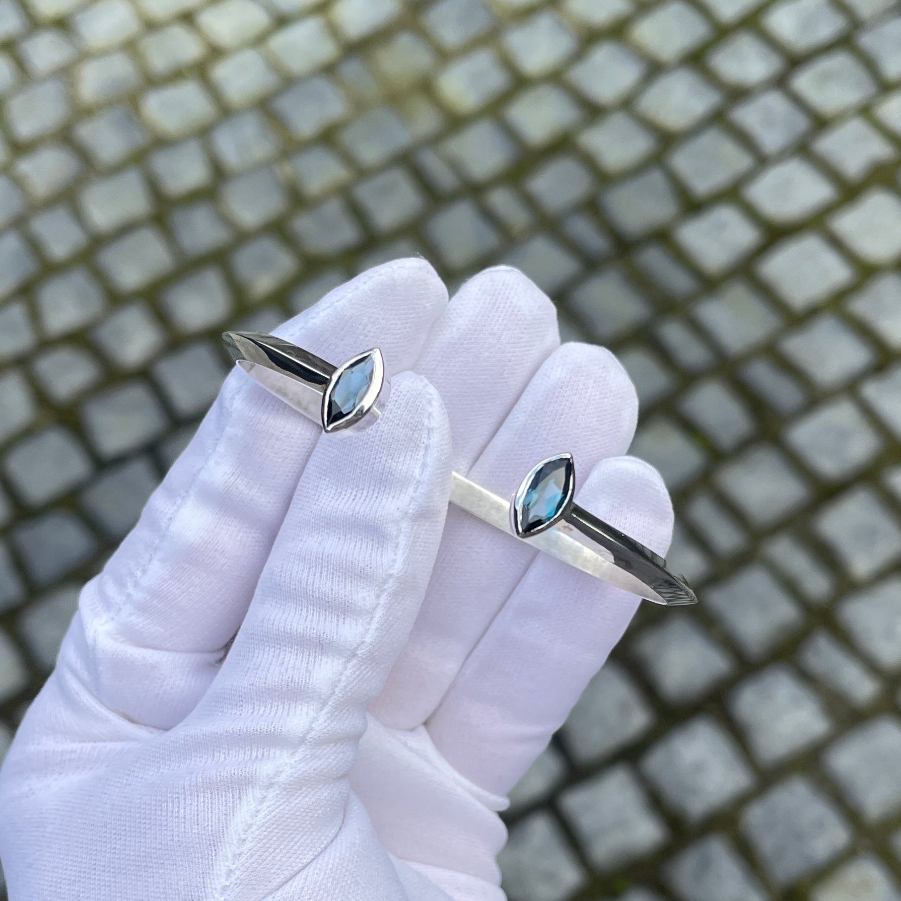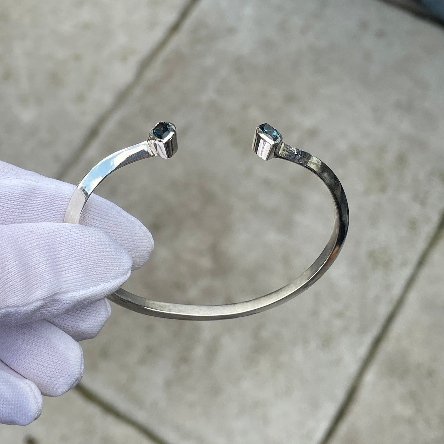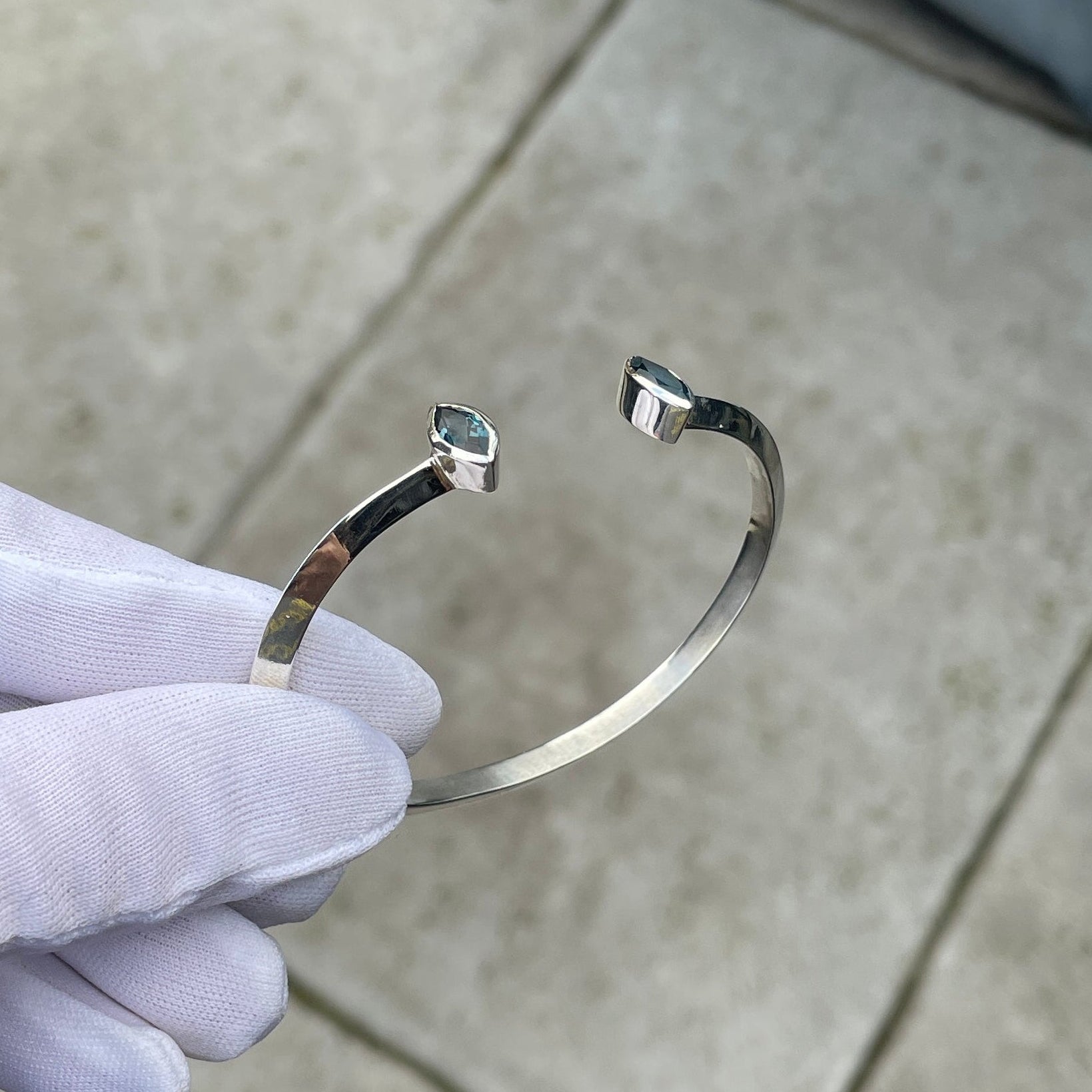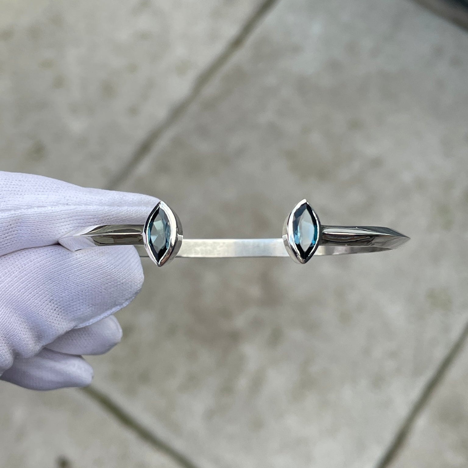 Collectors Bangle 003 is a delicate sterling silver bangle bookended by two marquise-cut blue topaz stones — one at each tip, framing the wrist with a quiet symmetry that feels both intentional and effortless.