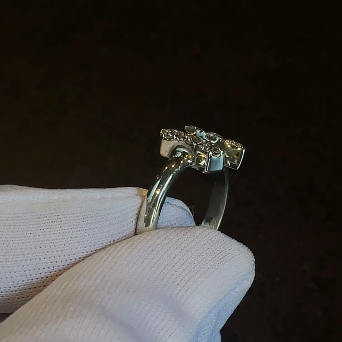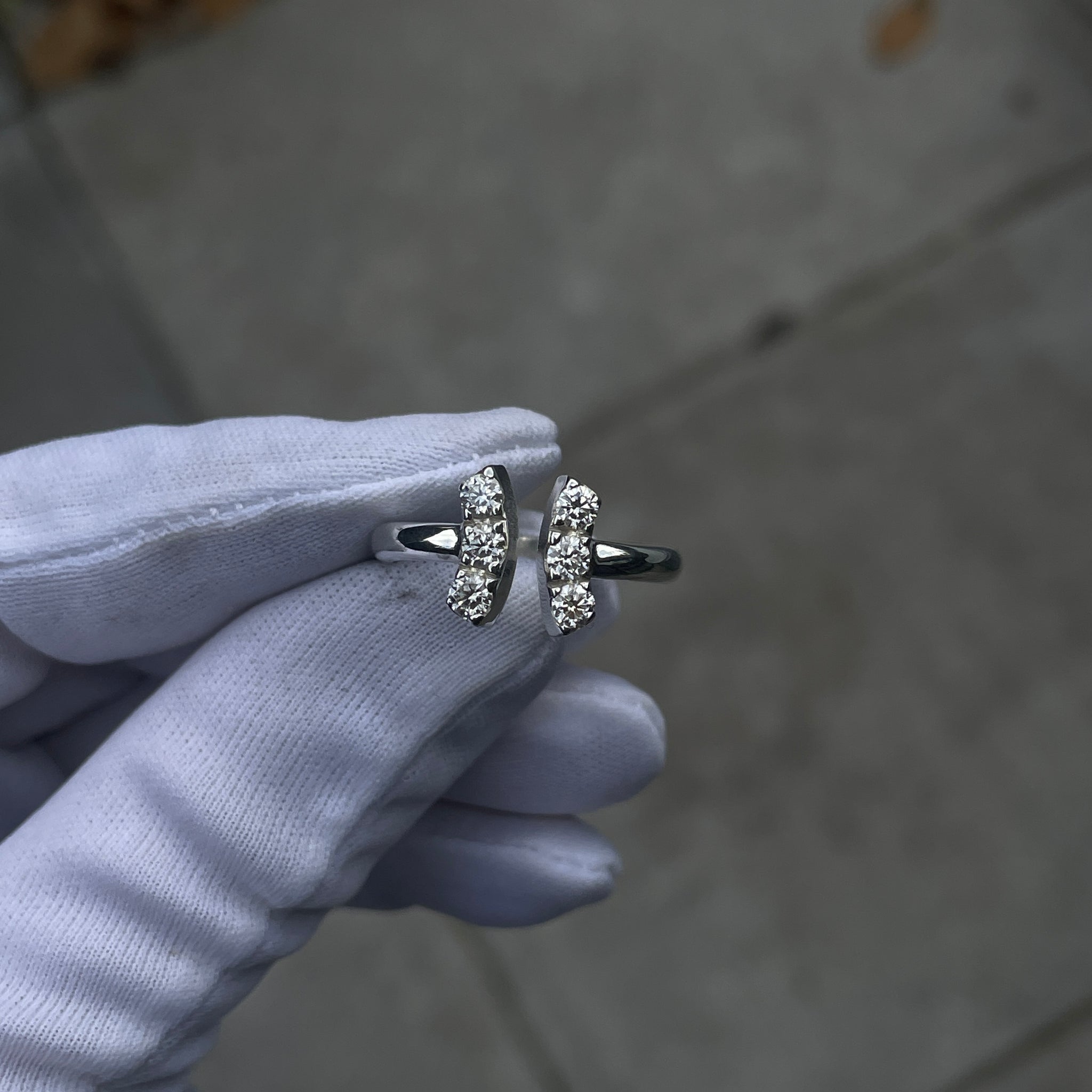 The ring has Six 3mm diamonds pave set into the bars, pave setting means each stone has prongs which hold the stone in place.
