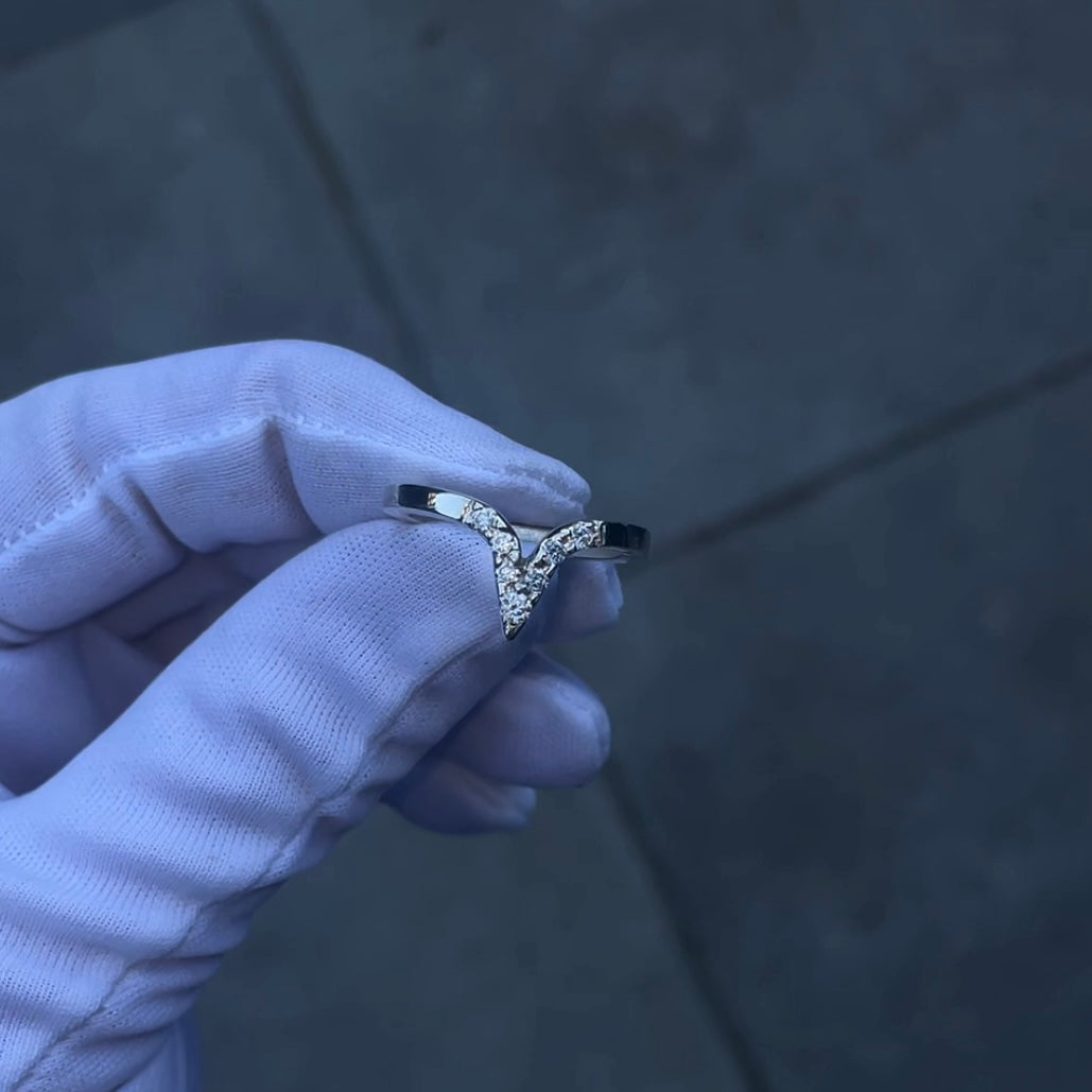 The centerpiece of this ring is the V-shaped arrangement of round cut, vvs1 lab grown diamonds. Each diamond is expertly cut to enhance its brilliance, ensuring that it sparkles and catches the light from every angle. The diamonds form a v shape following the rings shape.