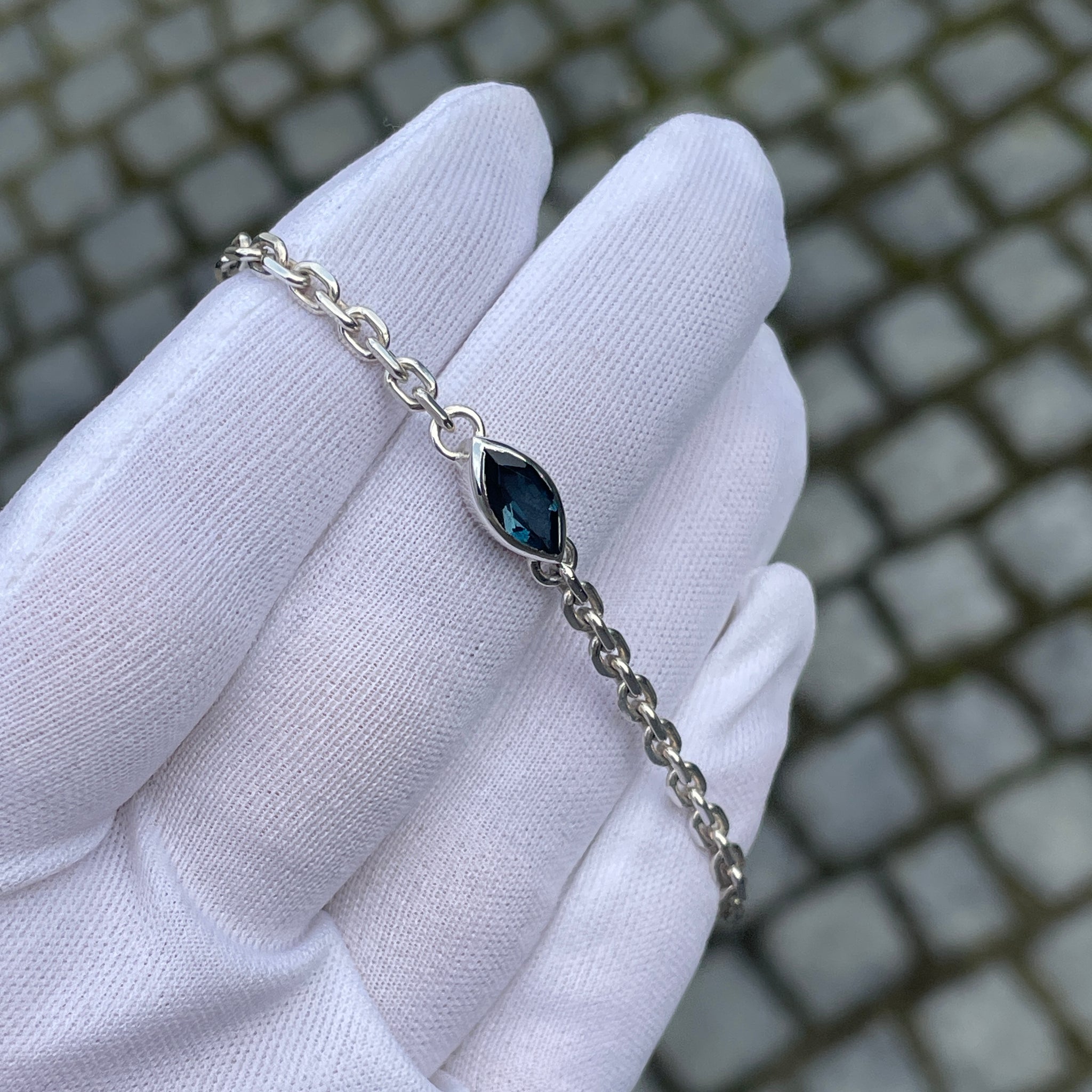 Introducing.. The Marquise Bracelet, A handcrafted elegant bracelet featuring a marquise-cut blue topaz set at the centre of a sterling silver fine chain. The elongated gemstone reflects soft ocean-blue tones, adding subtle yet captivating sparkle to your wrist. Its minimalist design makes it perfect error everyday wear while still feeling refined and special.